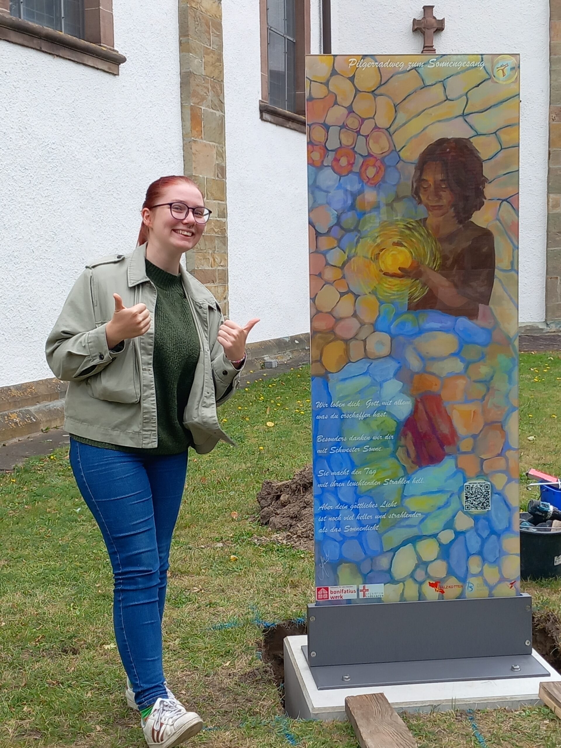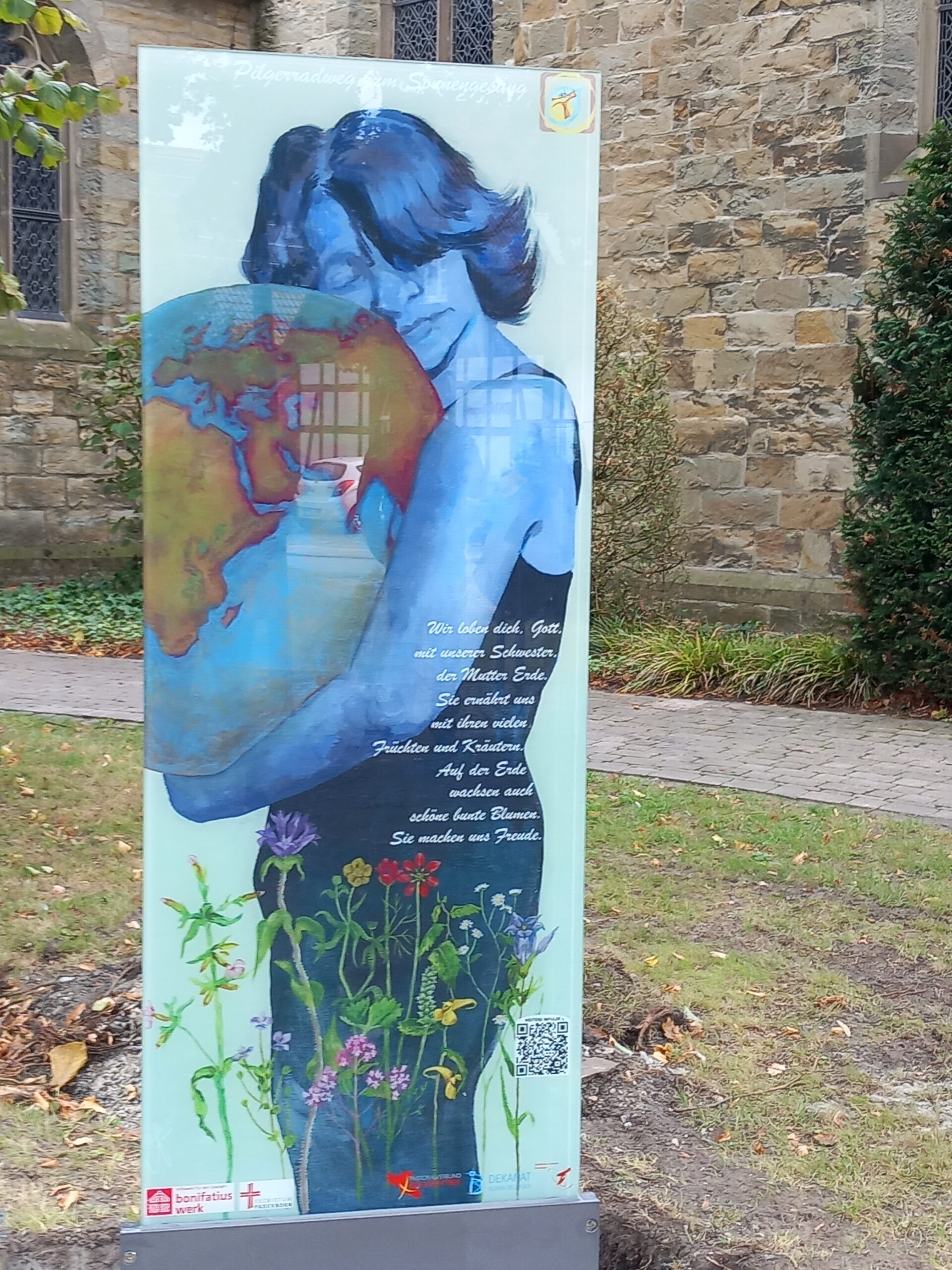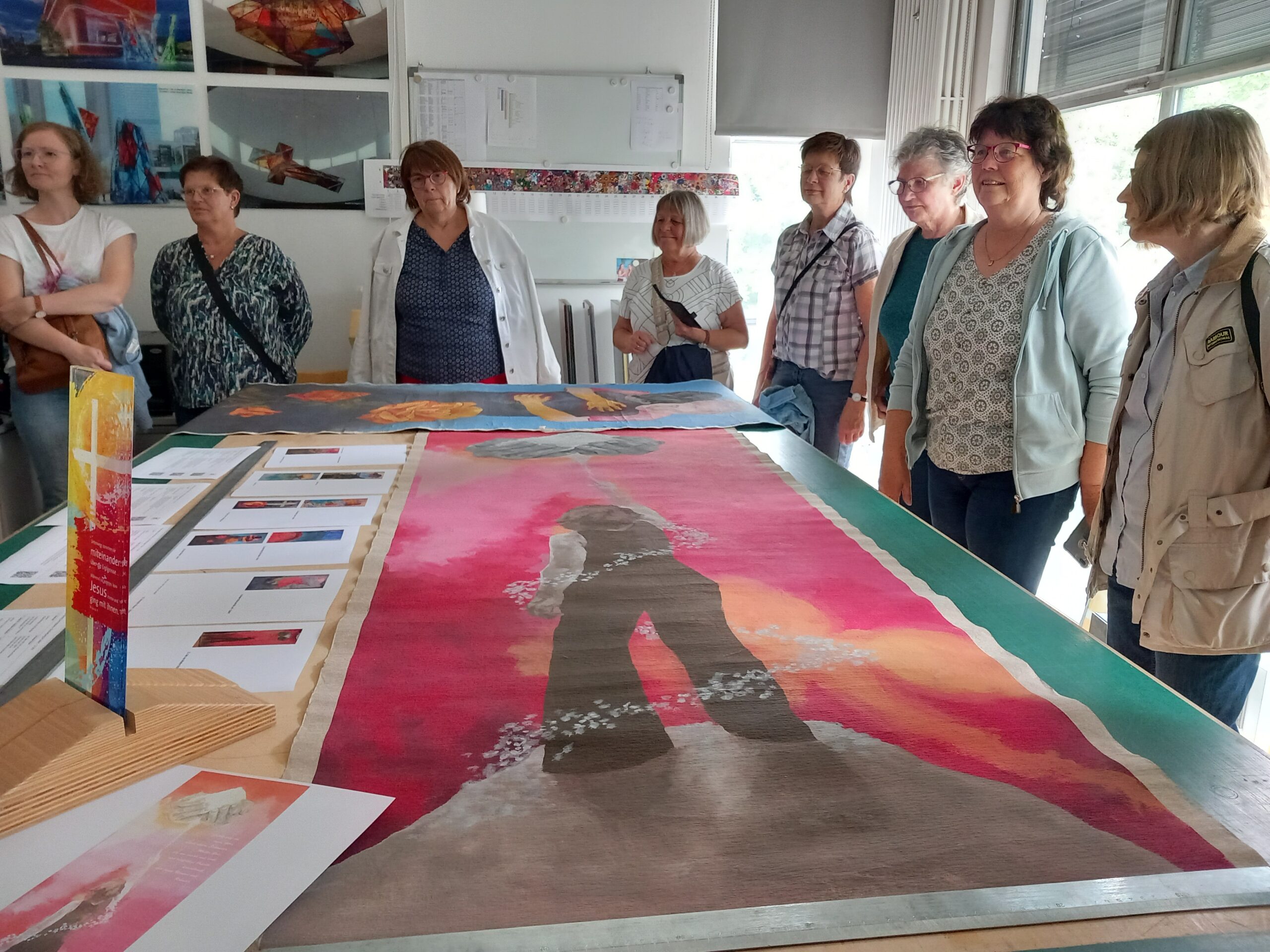 Die Künstlerin zeigt erste Entwürfe zu den Elementen des Sonnengesangs für 200x60cm großen Glasstelen, die in der Gruppe großen Anklang finden, Konkretisierung für Flyer und Homepage, zu der man durch QR-Codes geleitet wird, mit Texten und Audiodateien für spirituelle und praktische Impulse für Kinder und Erwachsene.