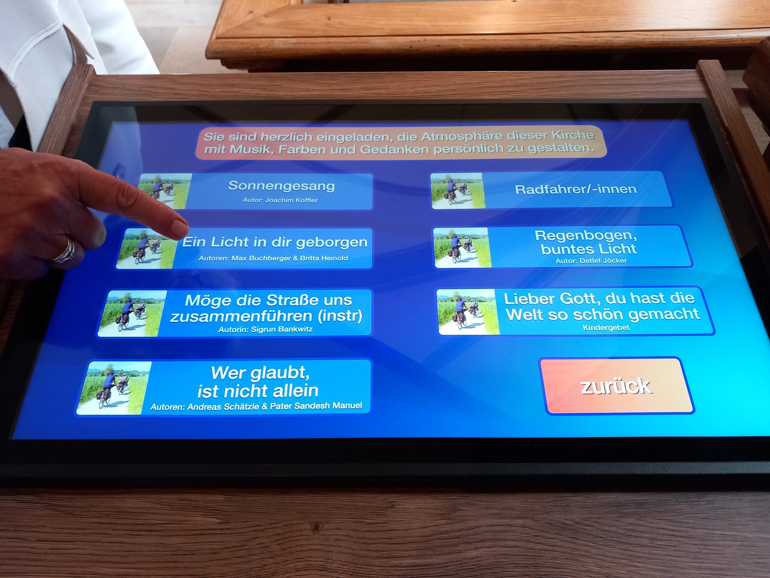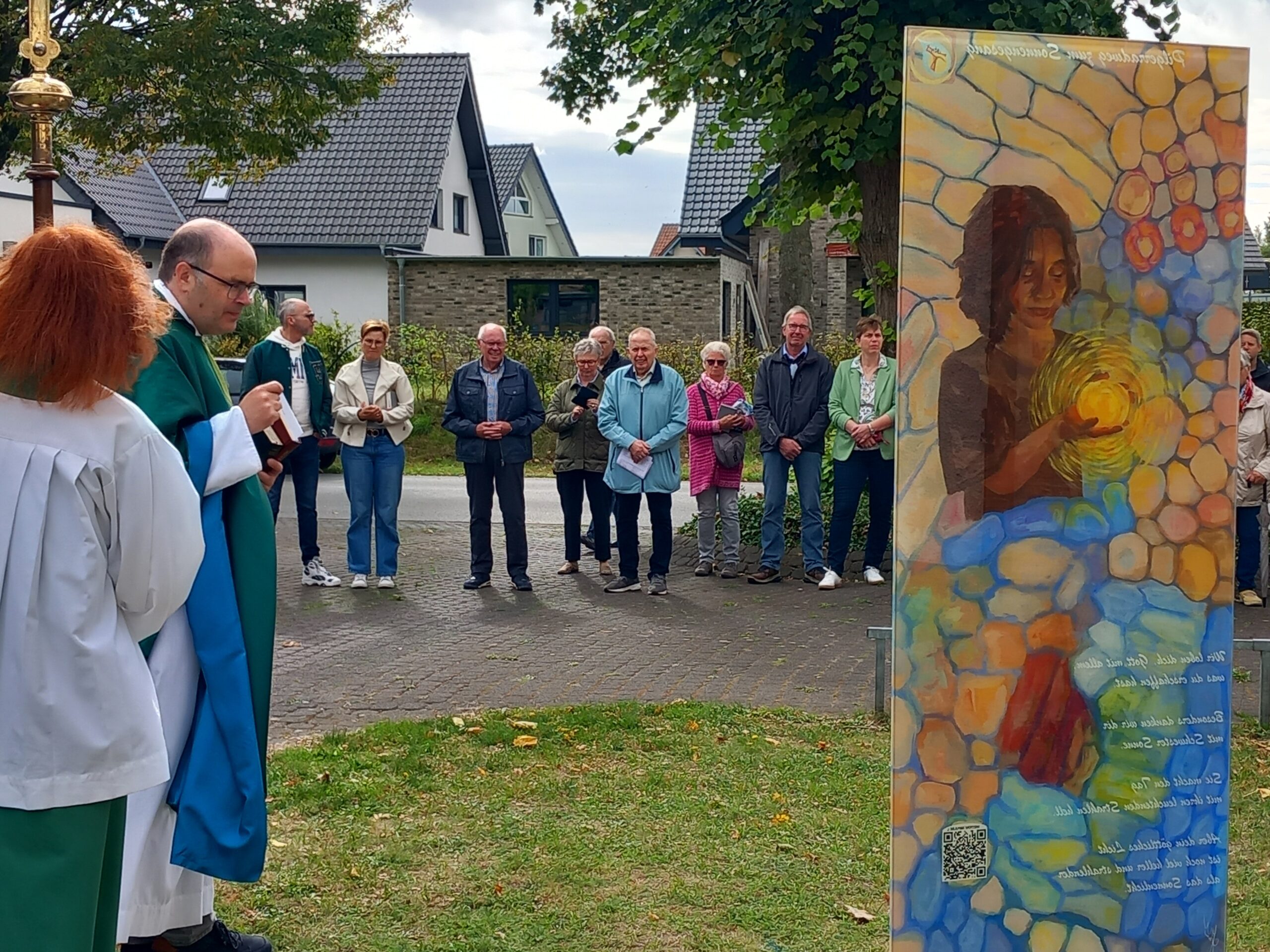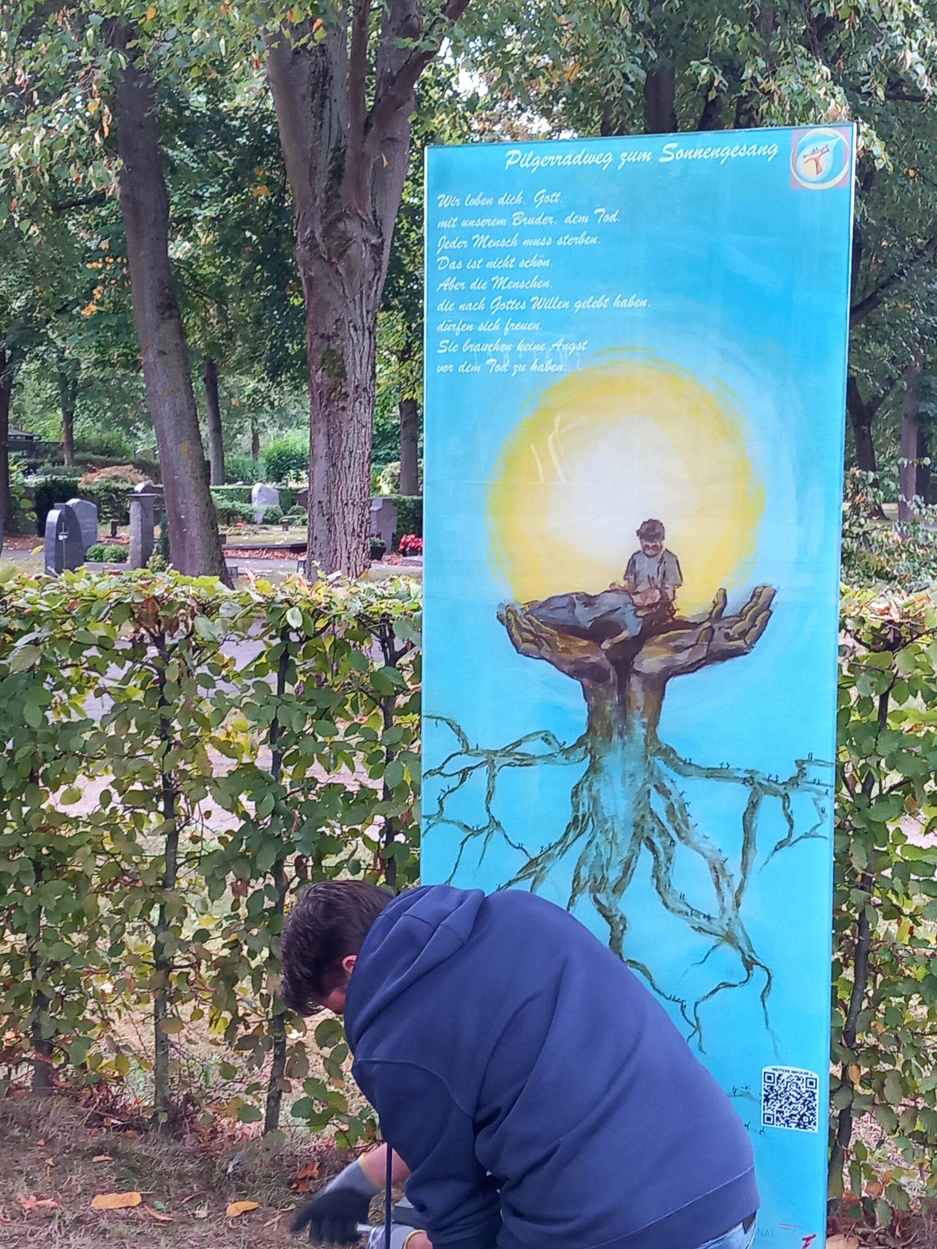 Die Künstlerin zeigt erste Entwürfe zu den Elementen des Sonnengesangs für 200x60cm großen Glasstelen, die in der Gruppe großen Anklang finden, Konkretisierung für Flyer und Homepage, zu der man durch QR-Codes geleitet wird, mit Texten und Audiodateien für spirituelle und praktische Impulse für Kinder und Erwachsene.