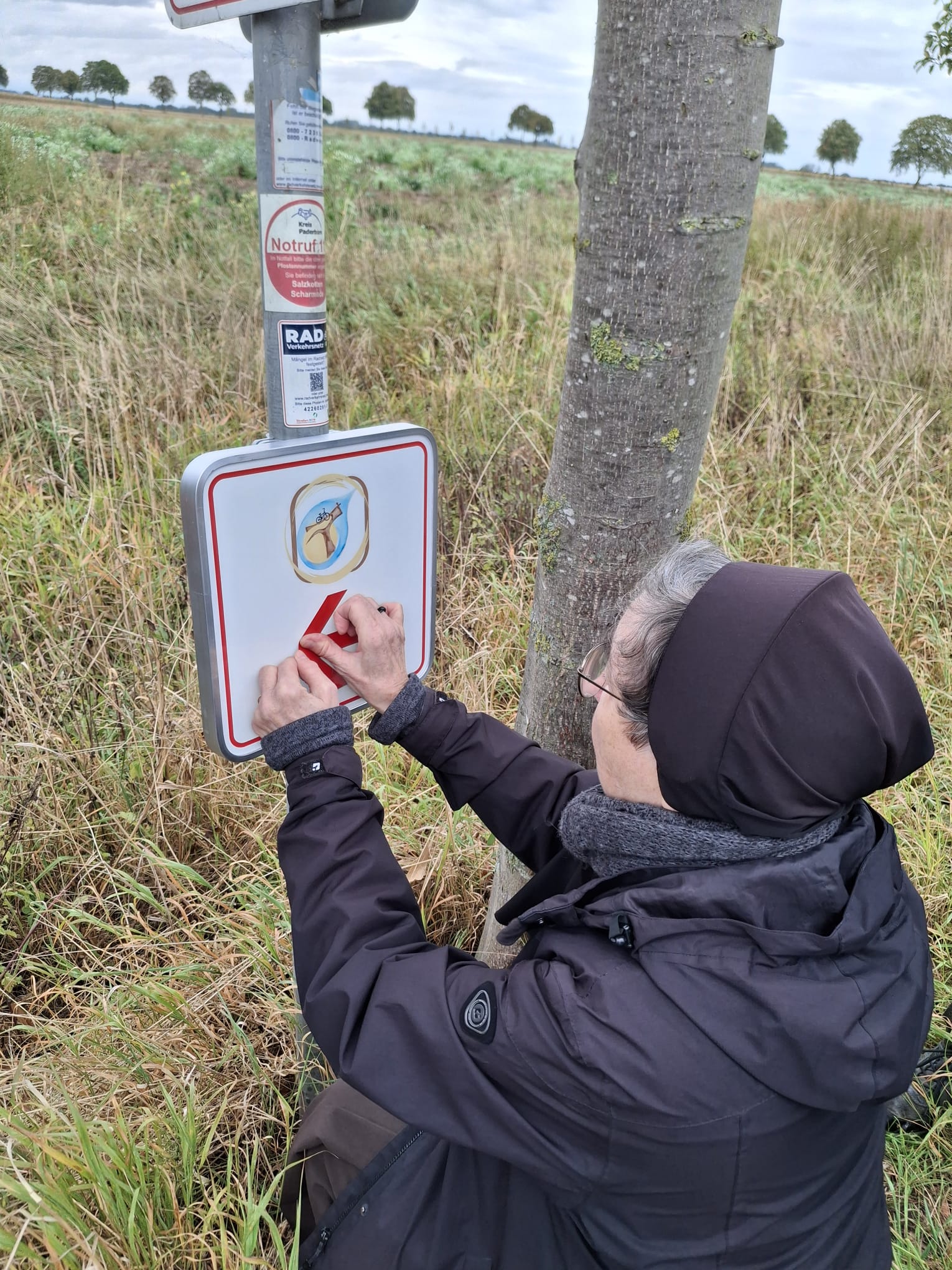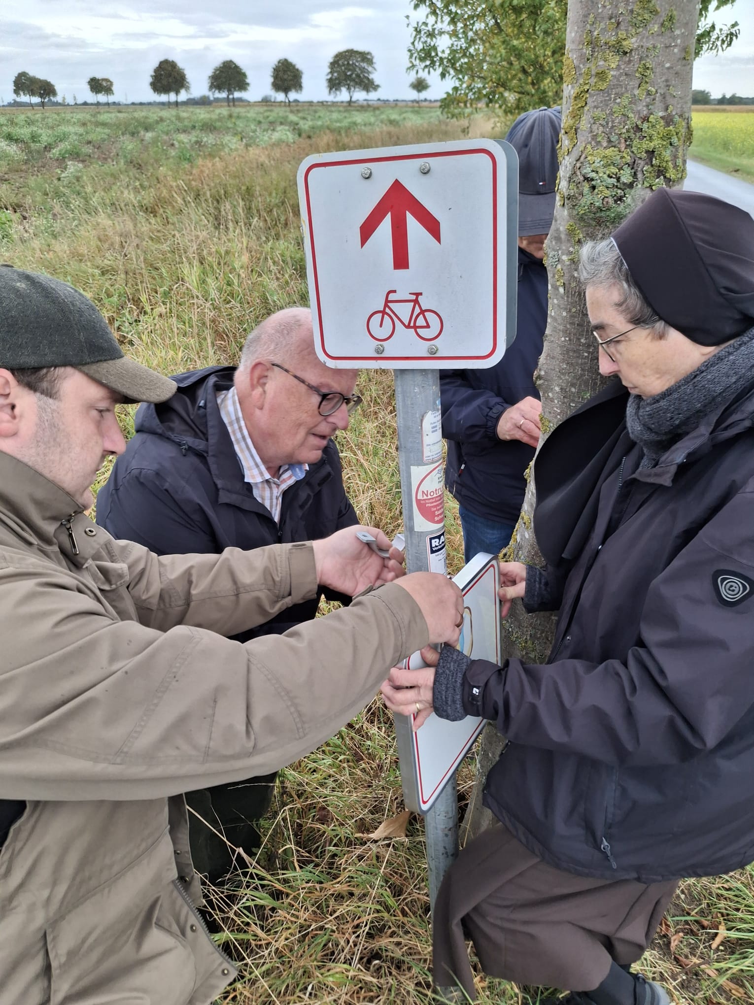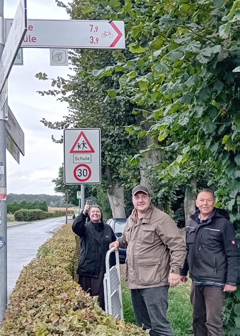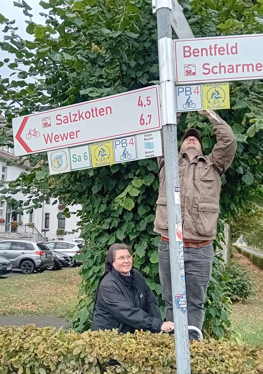 Zu viert auf dem Weg auf verkehrsberuhigten Straßen – wo müssen Hinweisschilder hin, damit alle den Weg finden? 52km sind es insgesamt! Zwischendurch Besuche in den Orten und Rücksprachen mit den Ortsgruppen zu den Standorten der Glasstelen, Genehmigungen von der Stadt und der Kirchengemeinde.